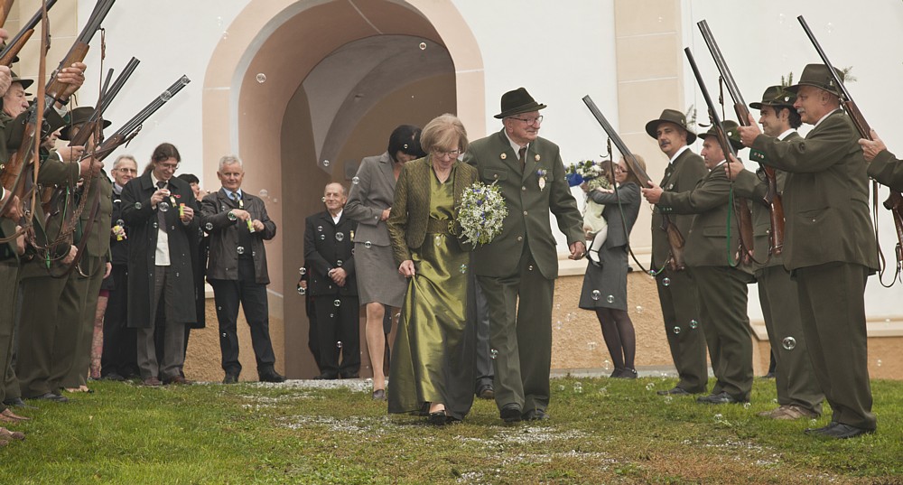 Doletela nas je namreč posebna čast, da smo lahko našega najstarejšega člana Lavbič Franca in njegovo življenjsko družico Štefko pospremili skozi koridor pušk k njuni diamantni poroki. Ta dan sta se po 60 letih skupnega zakona v cerkvi Sv. Uršule ponovno zaobljubila k večni zvestobi.