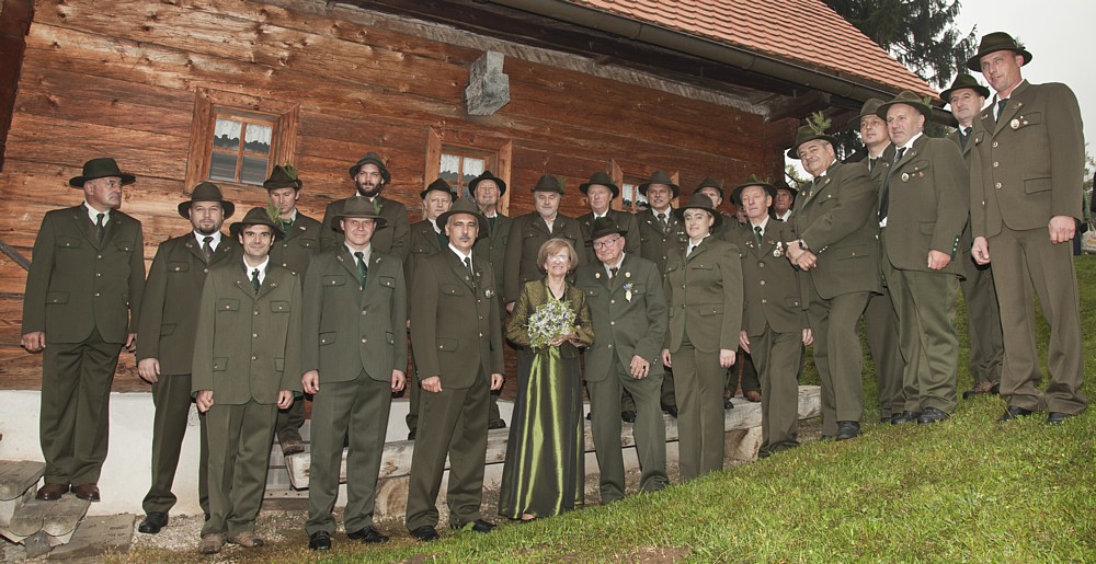 Poleg tega naš Franci to leto praznuje še 60 let nepretrganega članstva v lovski organizaciji. Za ta jubilej je 1. junija, ko je Savinjsko Kozjanska zveza lovskih družin Celje obeležila 90 let Slovenskega lovstva na celjskem dobil tudi posebno spominsko priznanje. Upravnemu odboru LD je prenesel željo svoje žene, da bi jima ob tej priložnosti lovci izkazali čast s pozdravom pušk, ko bosta ponovila zaobljubo izpred 60 let. V septembrski številki naše revije je namreč videla članek, ki opisuje kako so lovci pospremili mladoporočenca k njuni poroki. Kot je povedal, ga je ves čas njegovega udejstvovanja v lovstvu podpirala in vzpodbujala. Člani smo njegovo željo z veseljem sprejeli in na ta dan s ponosom pričakali pred cerkvijo. Najprej ju je v imenu lovske družine pozdravil starešina Povh Darko in jima izročil skromno darilo. Po tem pa sta skozi špalir dvignjenih pušk odšla v cerkev. Tudi po končani maši smo ju pričakali na enak način. Ob koncu pa smo se ob idilični hiši nekdanjega župnišča, v katerem ima sedaj prostore planinsko društvo Dramlje za spomin še skupaj fotografirali. Ob prigrizku, ki je sledil smo nadaljevali druženje z obema slavljencema. Ob tej priložnosti ga je naš predsednik vprašal ali bo prišel naslednji dan na prvi skupni lov. Naš Franci mu je hudomušno odgovoril:« Veš kaj, prva poročna noč je ponavadi naporna, saj bo v tem letu še dovolj priložnosti za jago«.