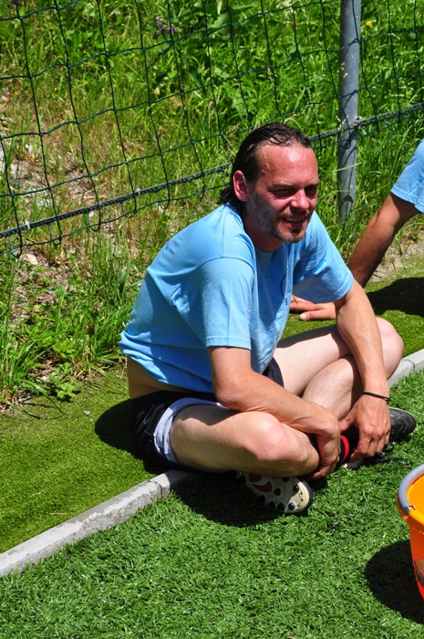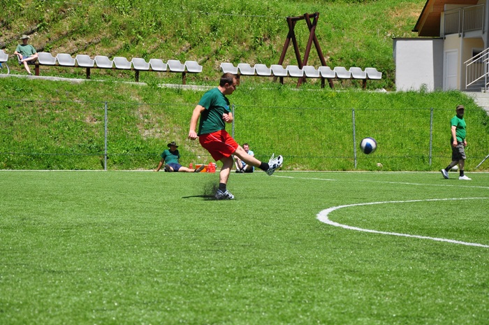 Kot tak sem bil prvi, ki sem prispel na mesto obračuna, nogometno igrišče v Železnikih, kjer je že nestrpno mencal Tarfila in se še z nekaj sotrpini v senci pod nadstreškom okrepčevalnice spraševal kje so vsi. Skupaj smo potem občudovali prihod forumske zastave, ki se je izgleda hotela nekajkrat zapeljati okoli igrišča, a je voznik zelenega terenca pozabil, da so Železniki v grapi in da so vožnje okoli utopija. Tu se pelje samo naravnost, pa še to samo v hrib, ker navzdol itak samo leti.