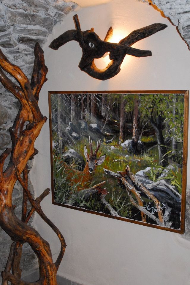 V prenovljenih spodnjih prostorih pa se nam je med stoletnimi oboki predstavil lovski slikar David Černuta. O Černuti je bilo napisanega že veliko. Zato bi na tem mestu dodal le, da smo se v LD Železniki odločili, da od Černute odkupimo eno njegovih slik, katero bomo v delegaciji odšli iskat k njemu v Log pod Mangrtom. Ker na vsezadnje so tudi lovci izpod Mangrta namenili humanitarno pomoč naši družini od katastrofalnih poplavah in je prav, da ostanemo v prijateljskih lovskih odnosih.