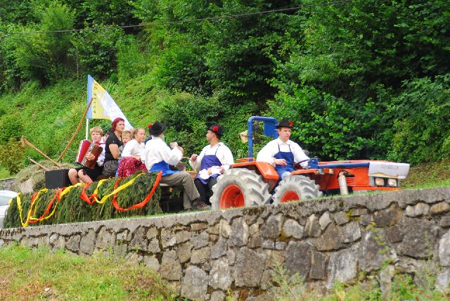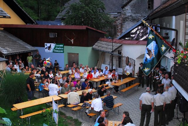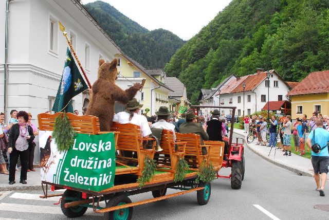 Nedelja je že kazala podočnjake, a na vrsti je bil sprevod po Železnikih. To leto so organizatorji 50. čipkarskih dnevov želeli v sprevod vključiti čim večje število društev, zato smo se vabilu z veseljem odzvali. Sicer smo opustili prvotno idejo, da bomo na vsakih 100m iz predelanih šibrenih nabojev streljali konfete, a smo kljub temu na lovski voz vzeli eno puško, en lovski rog, lovskega psa in družinski prapor. Ker lovstvo ni le domena moških, sta se na voz usedli tudi 2 naši lovki. Največja atrakcija pa je bil prav gotovo naš medved, ki se je po dolgoletnem prašenju v lovskem domu popeljal po Železnikih in si tako vsaj malo izprašil kožuh. Ko je sprevod prišel mimo gostilne, kjer imamo lovci največkrat zadnje pogone, je do našega voza pritekel šef gostilne, lovski voz se je ustavil in naredil kratek zastoj, a je po spitem kozarcu ta pravega šnopca še toliko hitreje zapeljal naprej. Tudi ostali soudeleženci sprevoda so pripravili zanimiv sprevod, od tradicionalnih prikazov gozdnih in kmetijskih opravil, do konjenikov in starodobnih traktorjev. V sprevodu so sodelovale tudi 3 godbe na pihala in pa 2 skupini mažuretk, ki so nam povzročale največ preglavic, saj so bile ene pred nami in jih nismo mogli ujeti, druge pa za nami in smo morali obračati glave nazaj.