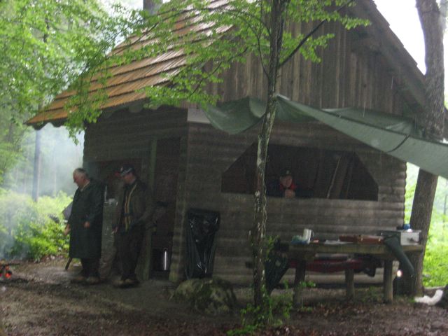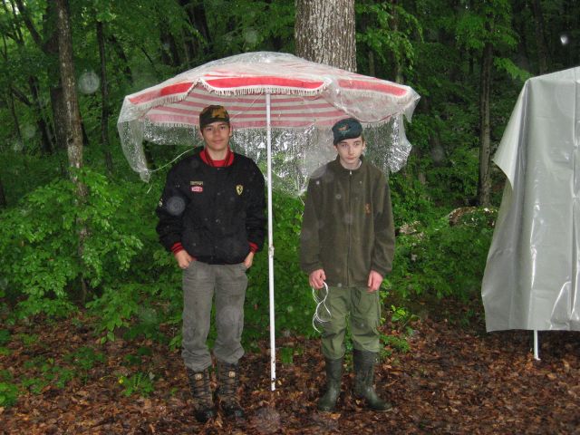 Vreme nam je tokrat zagodlo da še nikoli tako, saj je dež padal celi ljubi božji dan. Že zjutraj smo postavljali plahte in šotore v dežju in roko na srce to niti ni bila lahka naloga. Ja vem, fotke so letos zelo skope, ampak moraš razumeti, da so boljši aparati ostali na suhem in da je tekma potekala hitro in zato tudi ni bilo časa prav veliko fotografirati. Strelci pa tudi nismo imeli s seboj spremstva žena in prijateljev, ki so slikali v preteklosti. Tudi tekme na glinaste golobe ni nihče slikal saj smo streljali vzporedno z njo. Najhujše pa je to, da sem zaman treniral in popokal kup municije v dobri veri, da bom na risanici dosegel viden rezultat, saj je ta disciplina zaradi akvarija v zraku odpadla in smo jo nadomestili z streljanjem z malokalibrsko puško v dimu.