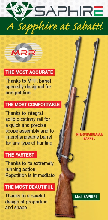 Podjetje Sabatti je v letu 2017 predstavilo nov model repetirne risanice Saphire. Saphire odlikuje kvalitetna izdelava in lep videz. Puška ima možnost nabave dodatnih cevi, katere so kvalitetno izdelane in izredno precizne, in s tem spreminjanje kalibra glede na vrsto lova. Že montirana piccatiny letev pa vam omogoča hitro montažo strelnega daljnogleda.